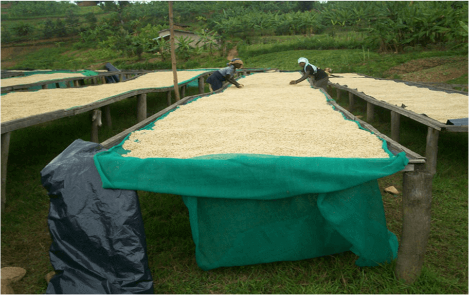 The quality of our coffee comes not only from the nature of Arabica coffee. The coffee cherries are floated into water; large cherries are separated from small and defected ones. It then passes through a wet processing which use water for moving and making the extraction of coffee beans. Beans are carefully hand sorted out by attentive Rwandan women to remain with high quality beans that are slowly sun dried to get the high quality parchment!